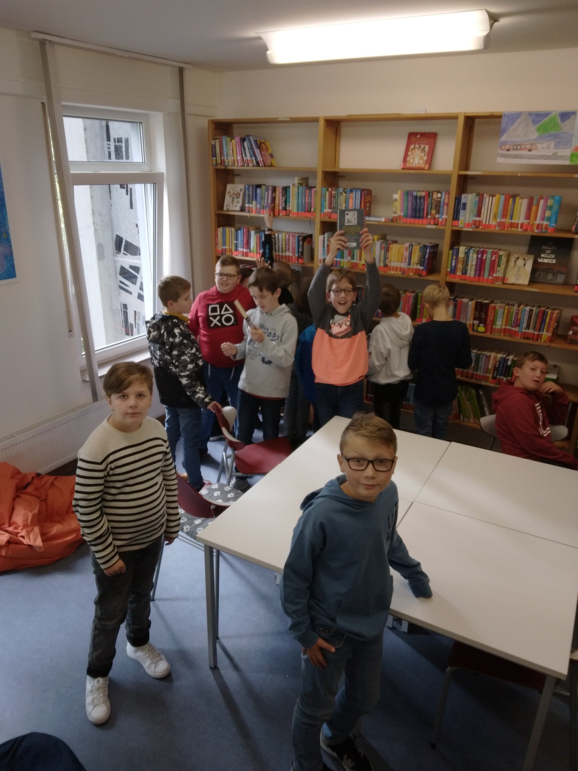 Beim Bibliotheksquiz konnten sie ihr neu erworbenes Wissen testen. Hier schnellten die Finger der vielen lesebegeisterten Schülerinnen und Schüler in die Höhe und die Quizfragen, auch über Kinderbuchklassiker, waren im Nu beantwortet. Am Ende der Stunde hatten die Kinder Zeit zum eigenen Erkunden der Bibliothek und durften sich ein Buch ausleihen.