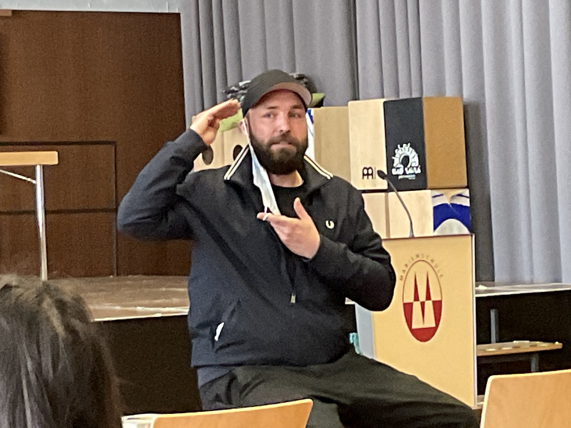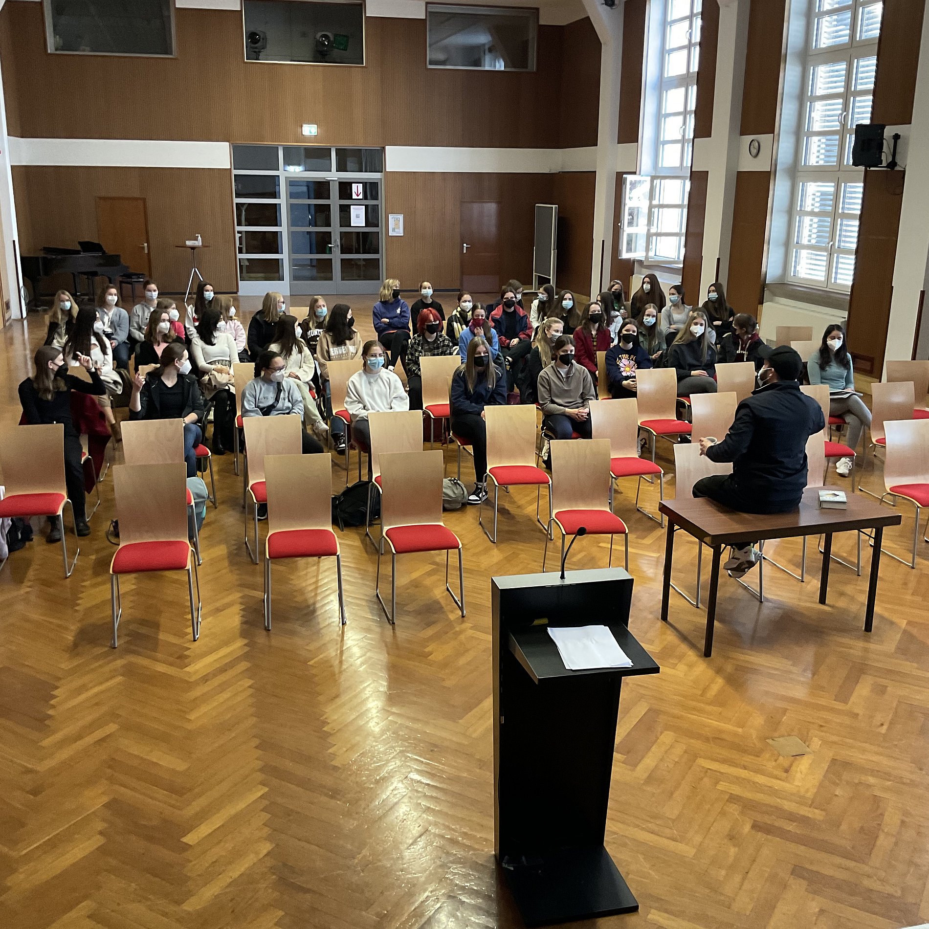 Am Donnerstag, dem 24.03.2022, fand in der 5./6. Stunde in der Aula eine Buchlesung mit anschließender Diskussionsrunde für die Klassen 9a und 9d statt. Besonderer Gast war Isaak Dentler, ein aus Frankfurt angereister Schauspieler und Synchronsprecher (u.a. Mitglied des Ermittlerteams im „Tatort“ aus Frankfurt).
