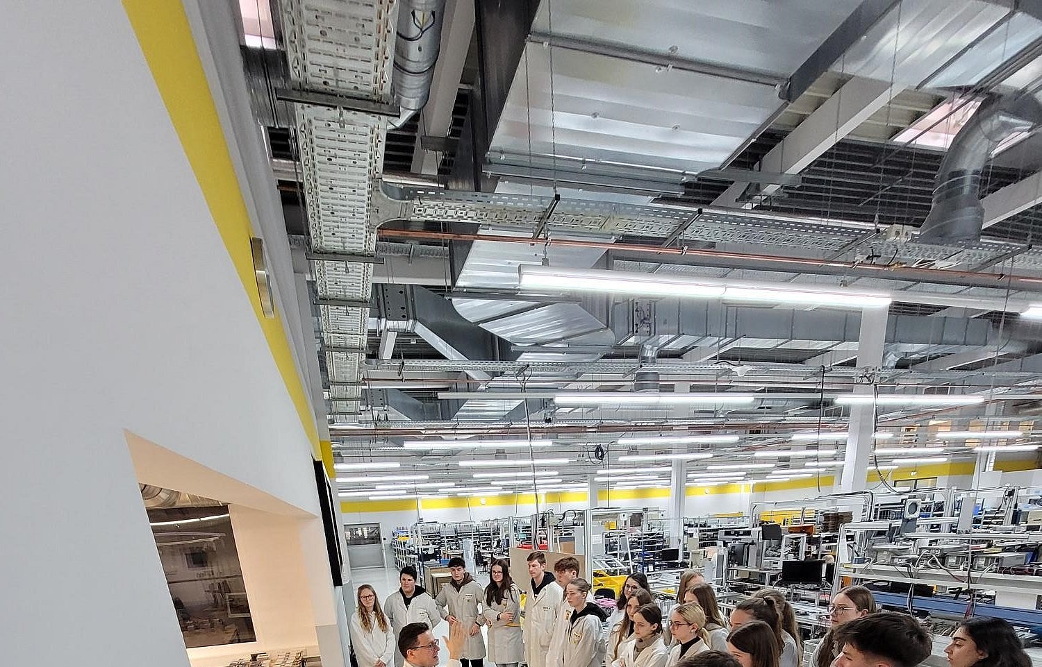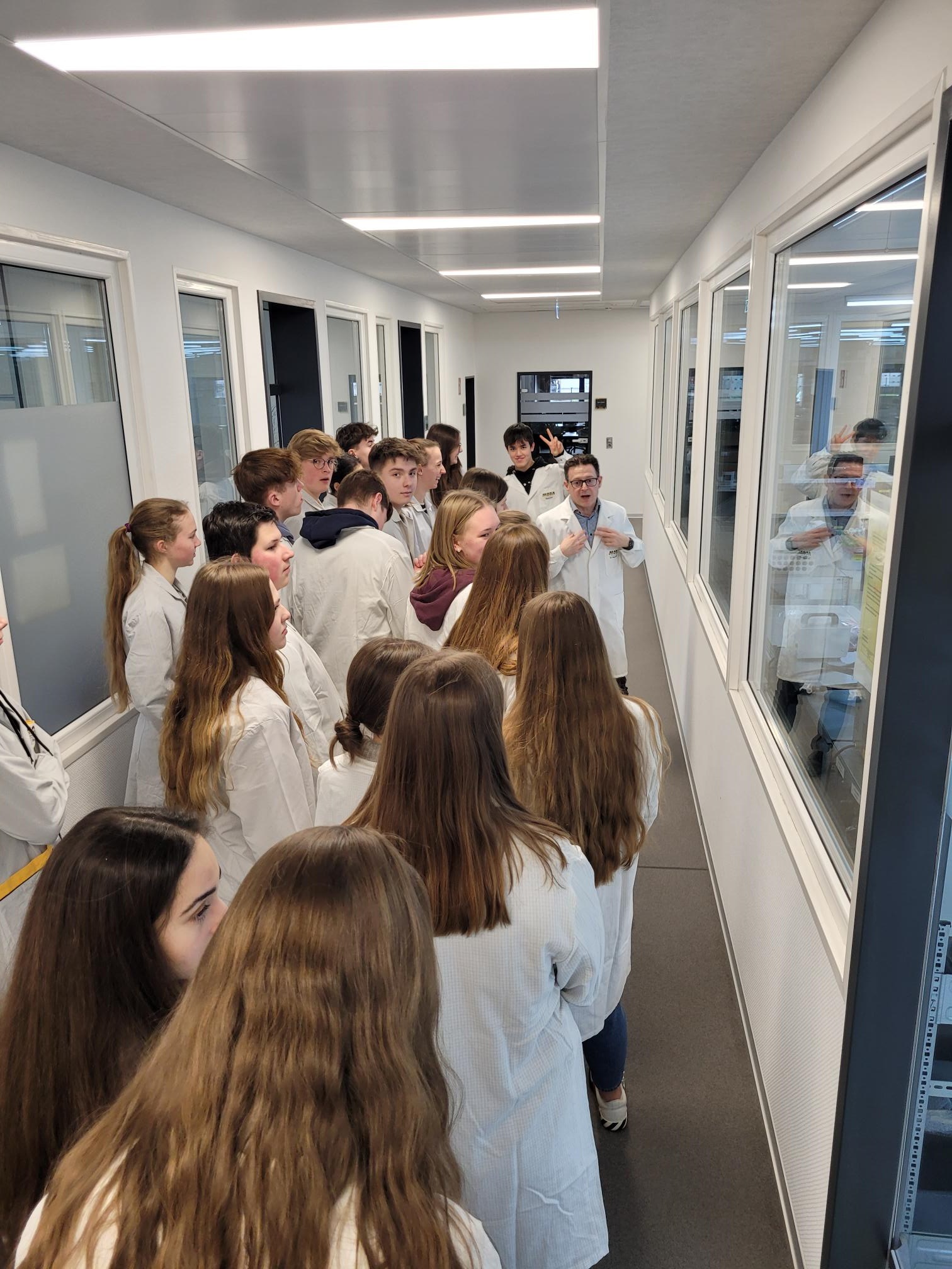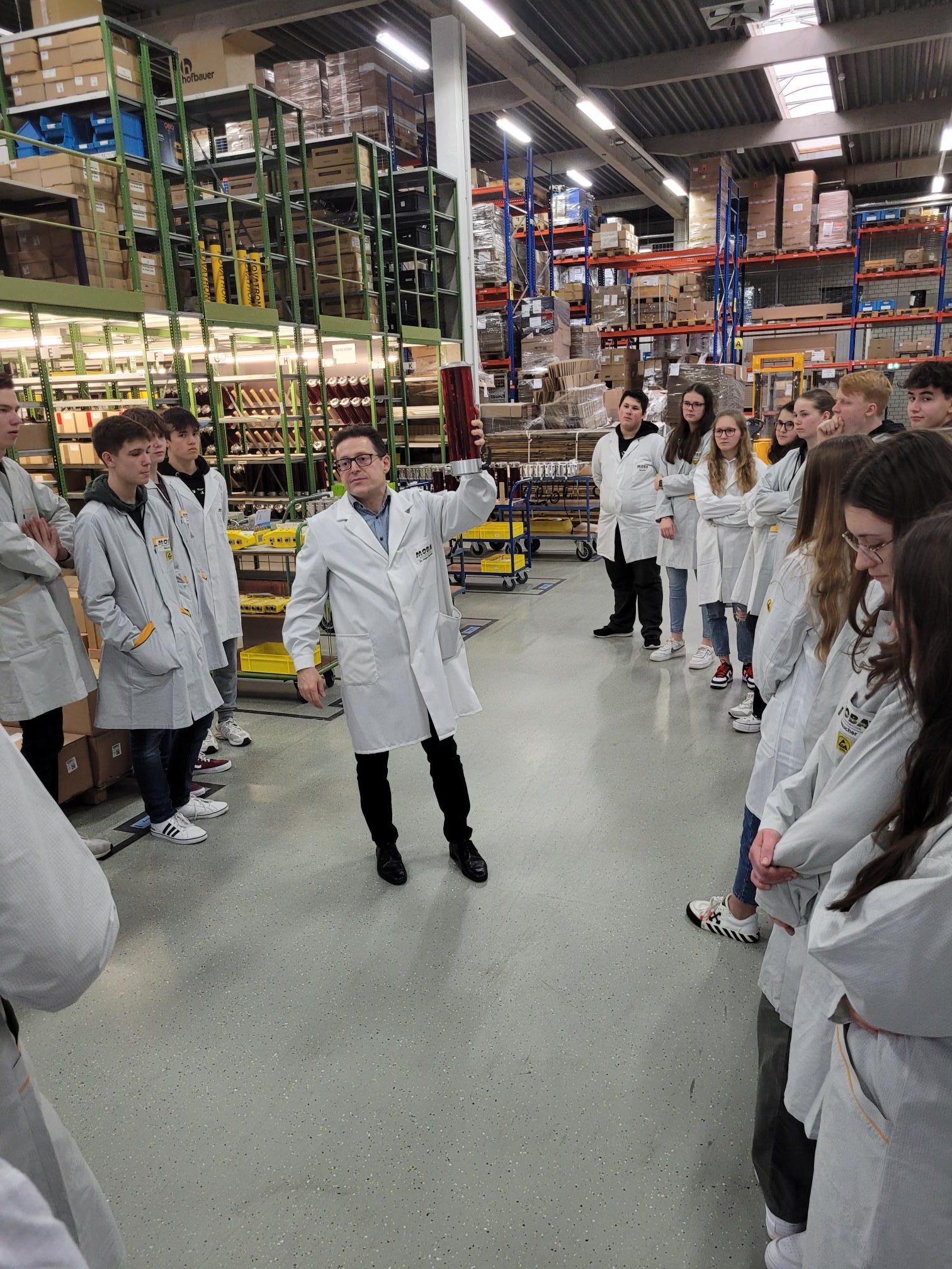 Über 30 Schülerinnen und Schüler der „Basics in Business“-Kurse der Limburger Marienschule und deren Kursleiter Jacob Koch und Benjamin Nahm besuchten am 9. Januar 2023 das Unternehmen MOBA Mobile Automation AG. Begrüßt wurden sie von Vorstandsmitglied Dr. Holger Barthel. Er führte die Gruppe der Marienschule durch den Betrieb und gab Einblicke in die Produktion des international tätigen Unternehmens.