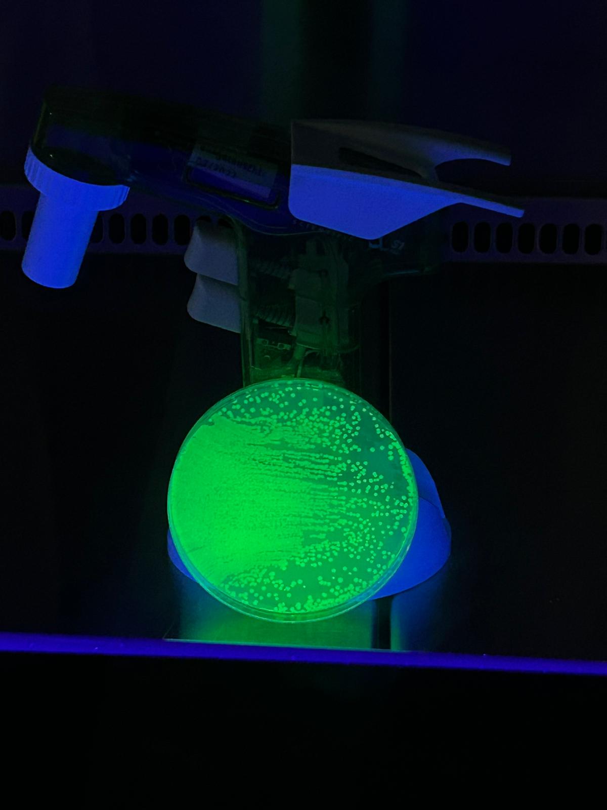 So wurde fleißig inkubiert, zentrifugiert und resuspendiert. Vor allem das Arbeiten mit der Eppendorf-Pipette stand dabei im Vordergrund. Nur mittels genauer Pipettierung kann nämlich ein valides Ergebnis erzielt werden. Da wir uns aber in Einheiten von Microlitern befanden, war das gar nicht so einfach. Unsere fertigen Petrischalen zeigten leider noch kein Ergebnis, da sie über Nacht inkubieren mussten. Aber eine vorbereitete Probe half aus: Unter UV-Licht leuchteten eindrucksvolle Muster grün in der Petrischale auf.