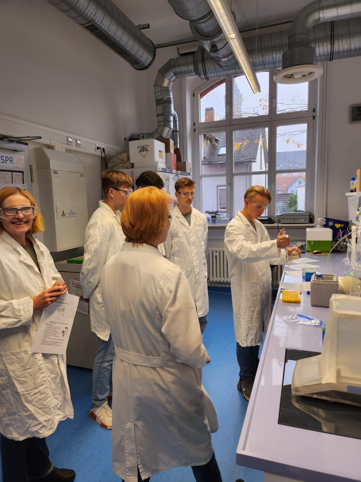 Dann wurden wir durch alle Räumlichkeiten geführt und durften Erstsemestern der Bioscience beim Praktikum über die Schulter schauen. Nach einer Mittagspause in der Cafeteria "Big Mama" besuchten wir noch eine Vorlesung. Zur Auswahl stand dafür eine Vorlesung für Medizinische Chemie (7. Semester) oder Fachunterricht Gentechnik für Biologisch-Technische-Assistenten (3. Semester).