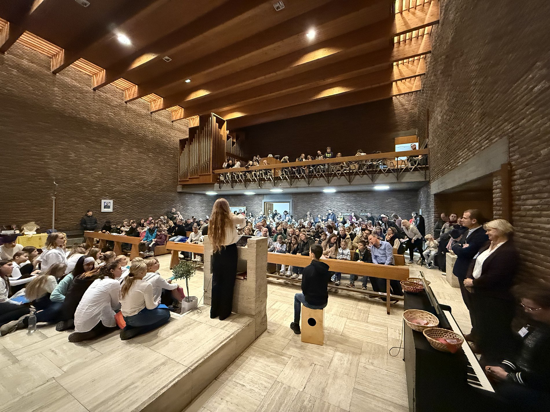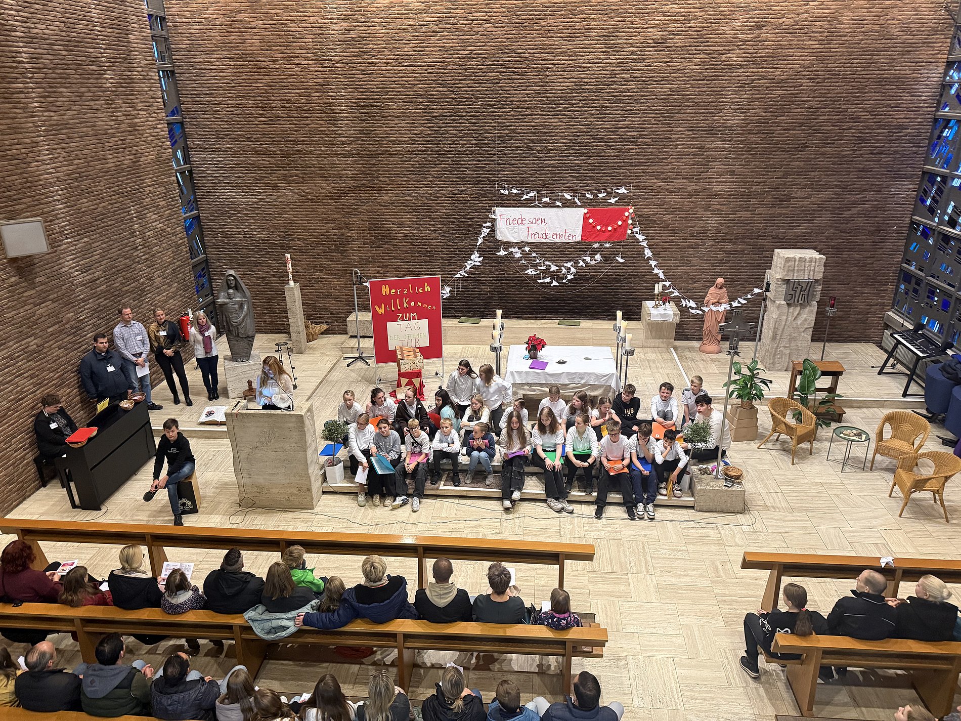 „Frieden stiften, Freude säen“ steht als großer Schriftzug im Altarraum der hauseigenen Kapelle, wo die Grundschülerinnen und Grundschüler am Samstagmorgen von den Mitgliedern des Schulseelsorgeteams und der stellvertretenden Schulleiterin Nicole Scharbach als Vertreterin der Schulleitung begrüßt wurden.