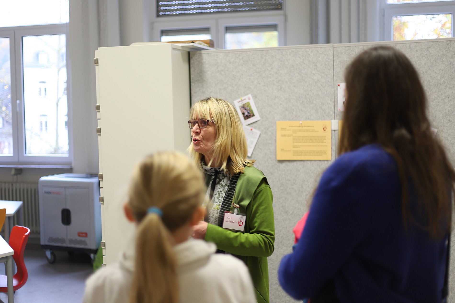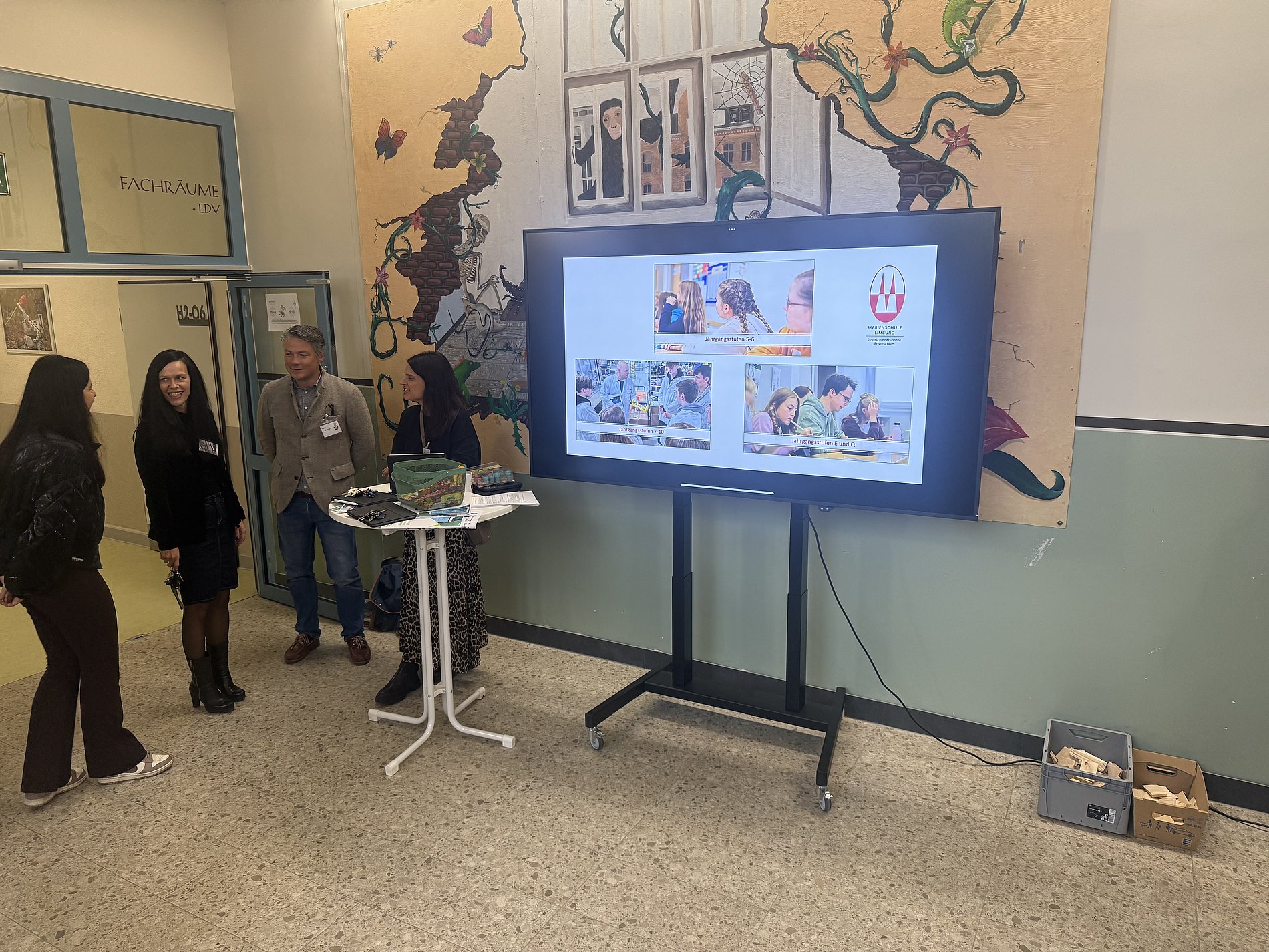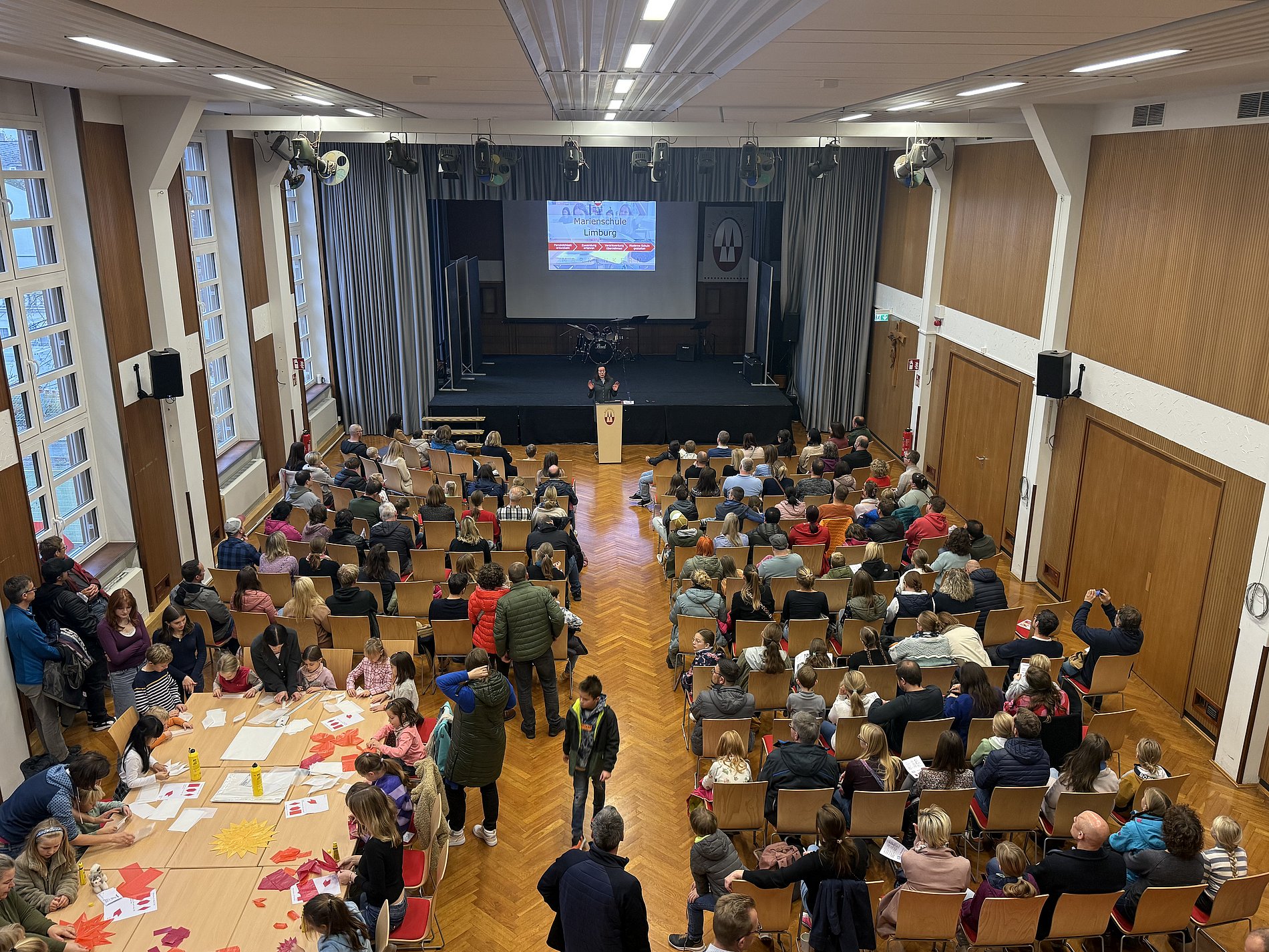 Frau Dr. Zilling präsentierte in der Aula die Eckpfeiler des Schulprofils und hob den Stellenwert des Leitgedankens „Miteinander lernen – füreinander da sein“ hervor. So Konnten alle Besucherinnen und Besucher zum Beispiel erfahren, was es mit dem getrennten Miteinander auf sich hat, warum die Fremdsprachenfolge wie gestaltet ist und wodurch das Digitalkonzept gekennzeichnet ist. Zusätzlich bestand hier auch die Gelegenheit, mit den entsprechenden Spezialisten direkt ins Gespräch zu kommen, denn die Fachlehrerinnen und Fachlehrer standen bereit, um Fragen zum Austauschprogramm und dem Unterricht zu beantworten. Darüber hinaus gab es eine Übersicht zur Nachmittagsbetreuung im Rahmen der ‚Schuloase’, die Sportlehrerinnen und Sportlehrer informierten über die schulischen Schwerpunkte und Angebote und die in diesem Bereich tätigen Lehrkräfte standen für Fragen im Bereich ‚Fordern und Fördern‘ zur Verfügung. Gerade dies ist allen an der Marienschule ein besonderes Anliegen: Die Kinder sollen sich hier an- und aufgenommen fühlen – mit ihren Stärken und Schwächen, an guten und an schlechten Tagen.