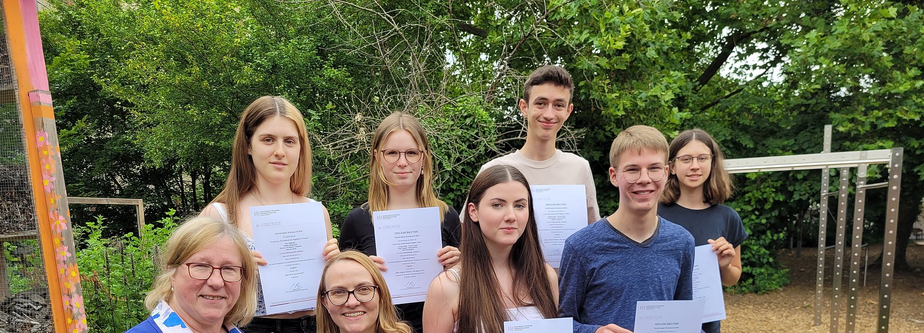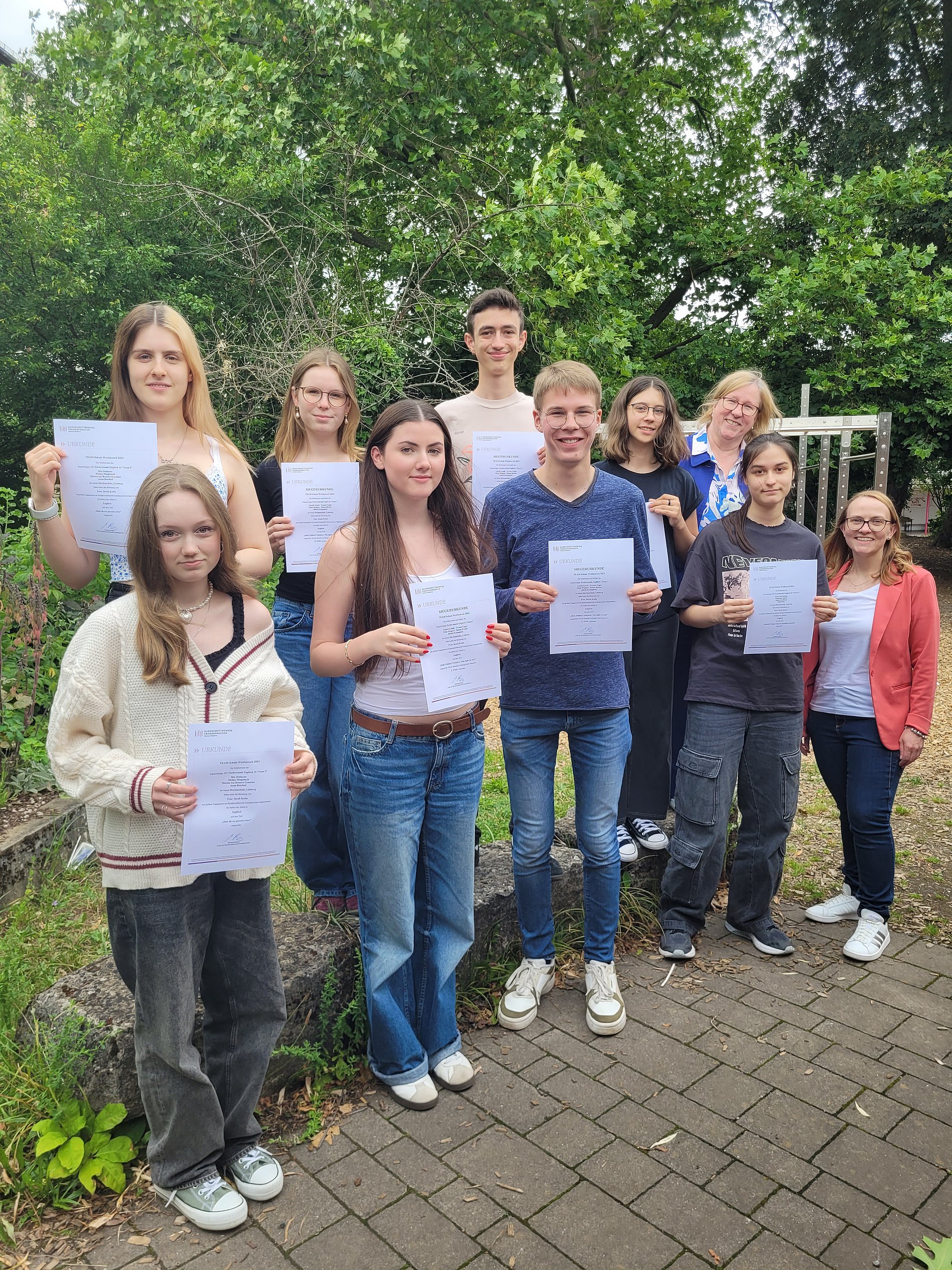 Im Rahmen der Begabtenförderung „Forderstunde Englisch“ haben 13 Schülerinnen und Schüler der Jahrgangsstufe 10 in Kleingruppen am Bundeswettbewerb Fremdsprachen in der Kategorie „TEAM Schule“ teilgenommen. Während des gesamten ersten Halbjahres haben die einzelnen Gruppen Videos und Podcasts zu selbst gewählten Themen aufgenommen und die Ergebnisse können sich sehen lassen: Es wurden sehr hochwertige Beiträge zu politischen und gesellschaftlichen Themen erarbeitet, in denen die Schülerinnen und Schüler zeigen konnten, wie groß ihr englisches Vokabular ist.