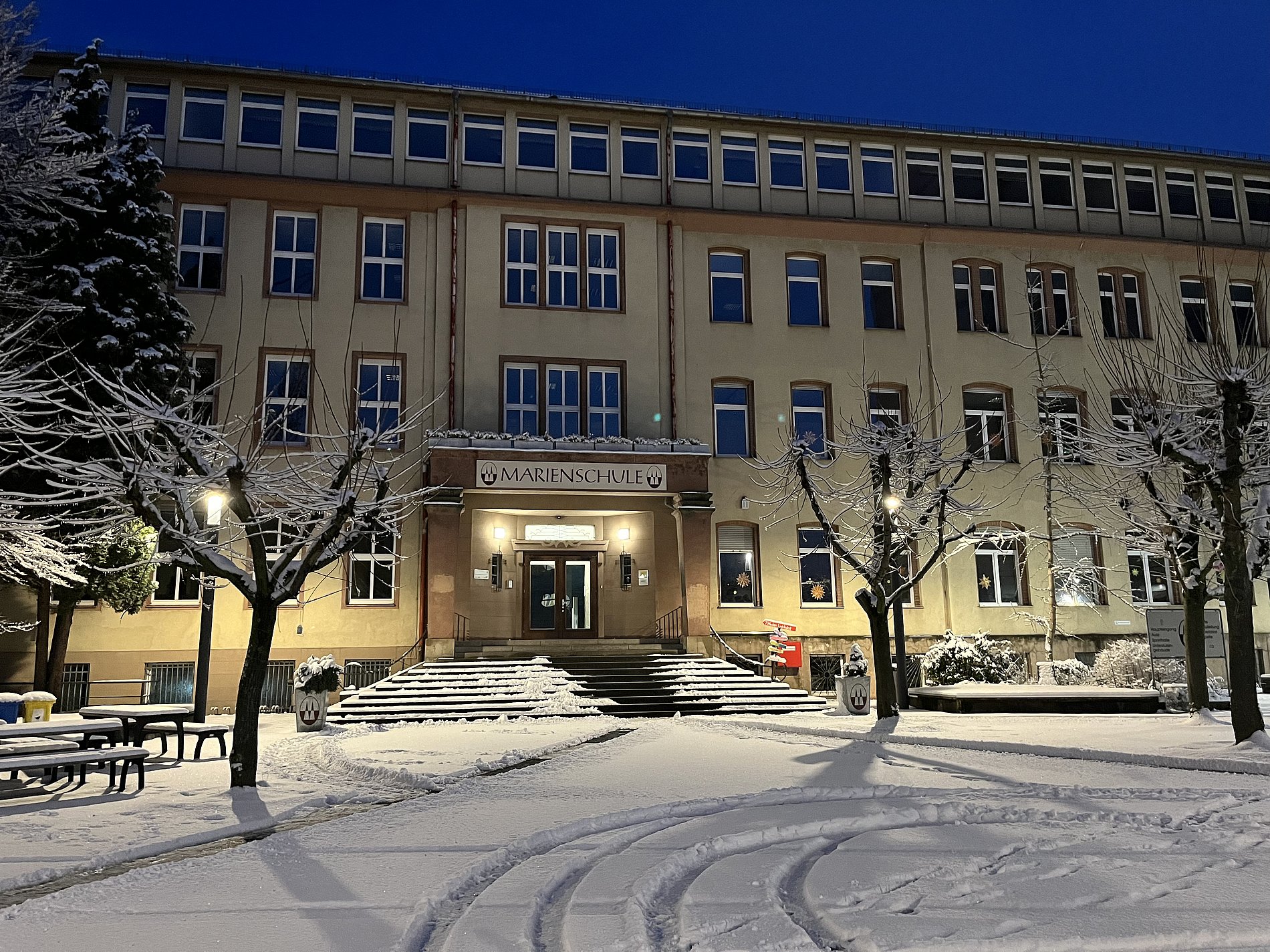 So trafen wir uns dann am Abend der Abfahrt voller Vorfreude auf dem verschneiten Schulhof der Marienschule. Nach einer kurzen Ansprache wurde das gesamte Gepäck in den Bus geladen und dann machten wir uns endlich auf den Weg. Nach einer langen Fahrt durch die ganze Nacht, freuten wir uns, als wir morgens endlich die ersten verschneiten Berge erblickten.