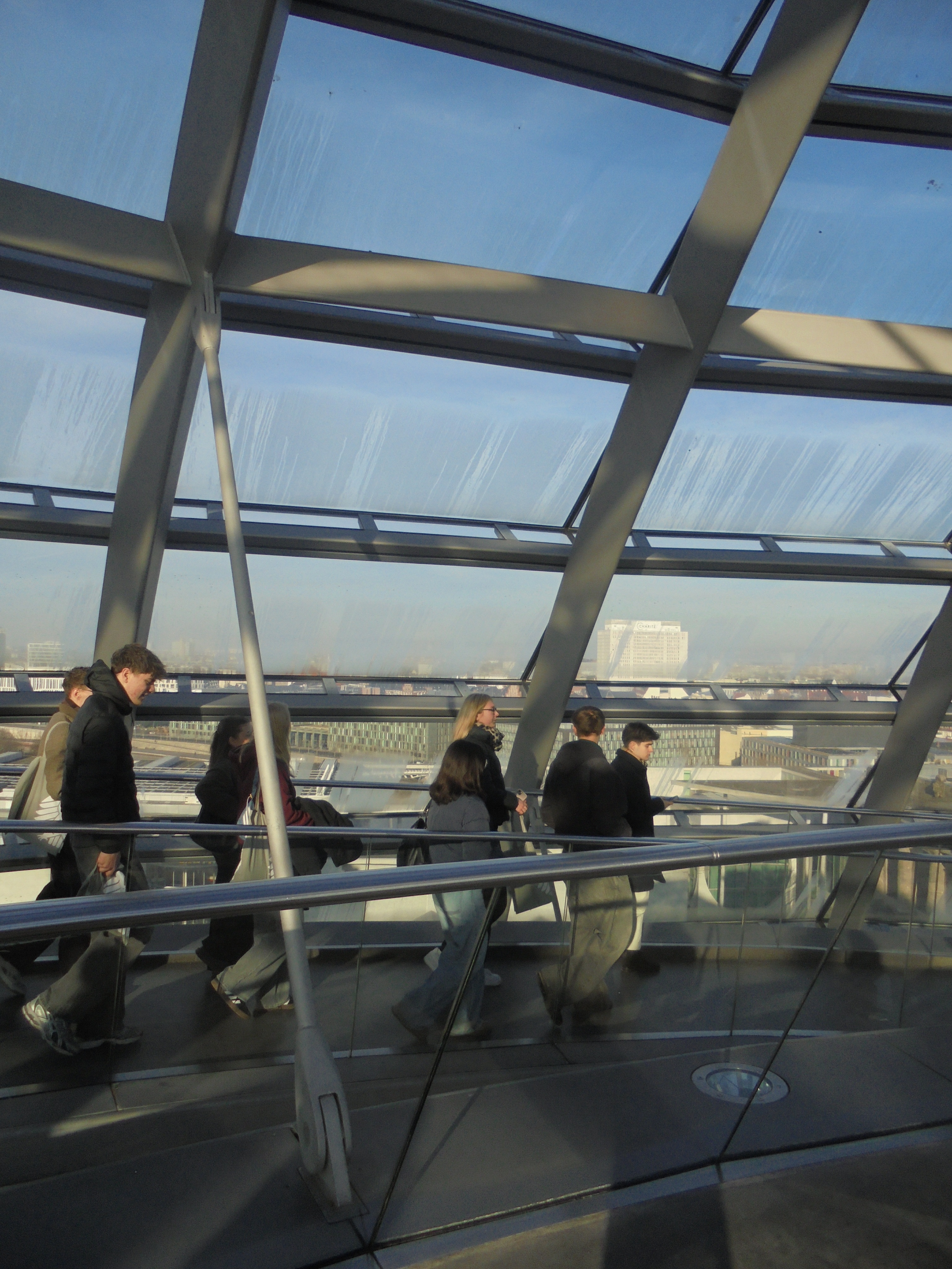 Ebenfalls spannend und nicht minder interessant war das Gespräch mit dem CDU- Bundestagsabgeordneten Klaus-Peter Willsch aus dem Wahlkreis Limburg-Weilburg. Er erzählte unter anderem davon, wie er zu seinem Beruf kam und beantwortete alle unsere Fragen über die aktuellen Geschehnisse sowie Politik im Allgemeinen. An dieser Stelle gilt ein großer Dank dem Büro von Herrn Willsch, denn insbesondere dank Frau Söders ergiebigen Bemühungen war unser Besuch im Bundestag und somit die Berlinfahrt überhaupt möglich. Nach einem Abstecher in die sehenswerte Kuppel des Reichstagsgebäudes folgte gegen 14:30 Uhr ein gemeinsames Mittagessen in der Mensa des Paul-Löbe-Hauses inklusive traumhaftem Spreeblick.