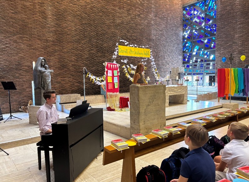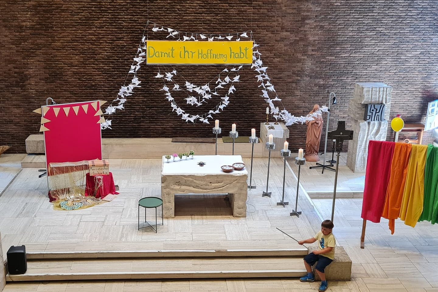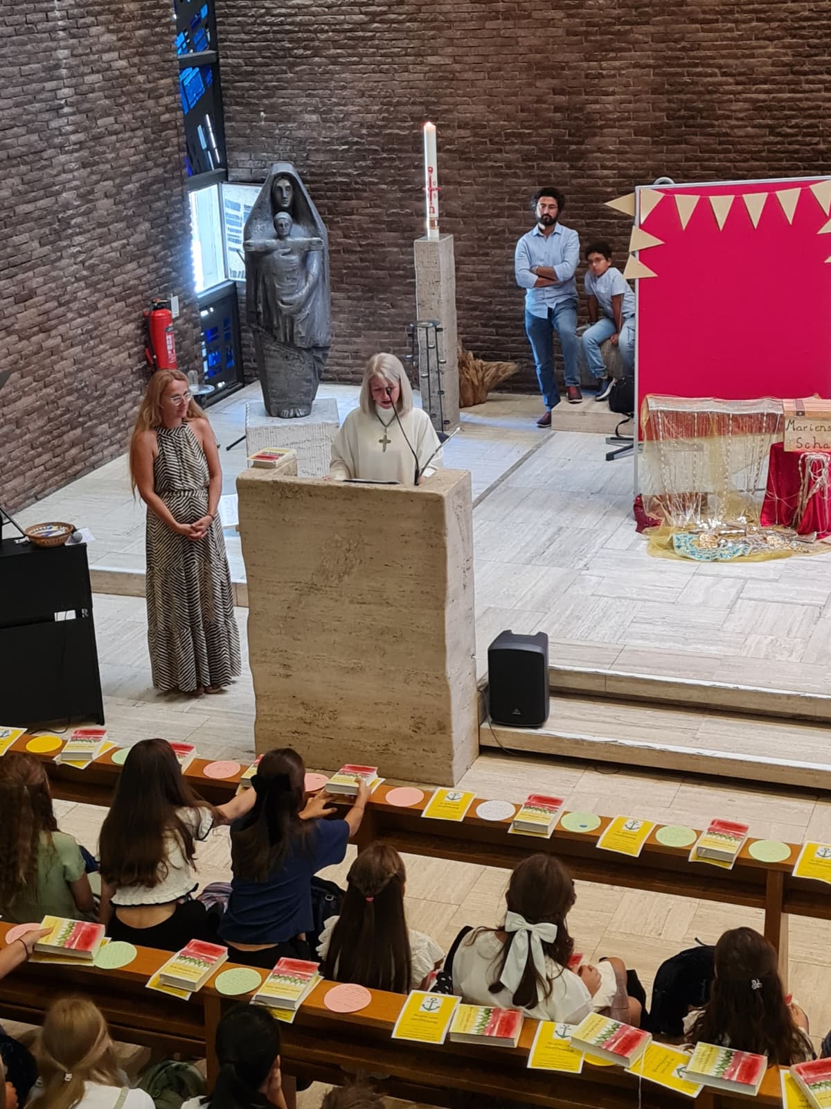Die Einschulung startete in unserer Hauskapelle mit einem spannenden Gottesdienst, gestaltet von Frau Häuser-Kepper und Frau Kunkel aus dem Schulseelsorge-Team. Dabei konnte mit vereinten Kräften die verlorene Hoffnung im „Marienschulschatz“ wiedergefunden werden. So konnten die neuen 5 Klässlerinnen und Klässler mit einer guten Portion neuer Hoffnungen ihren neuen Lebensabschnitt beginnen: