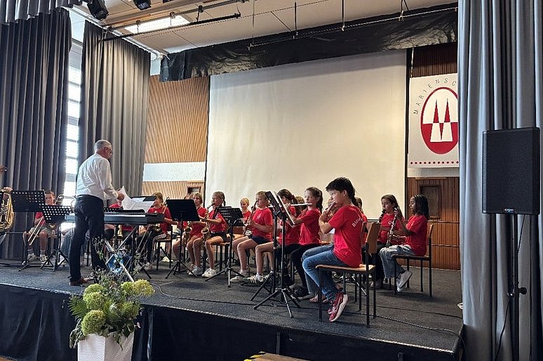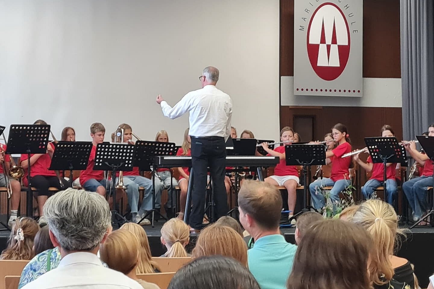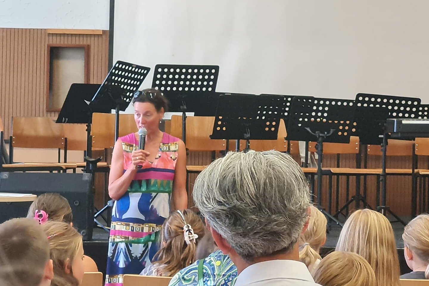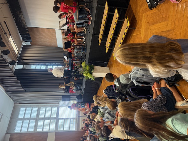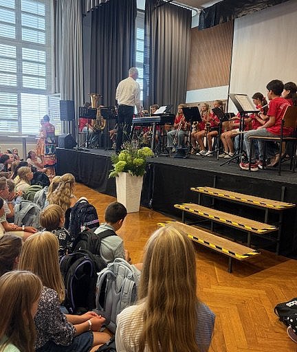 Im Anschluss wurden die neuen Schulgemeindemitglieder in der Aula von Herrn Pabst und der Bläserklasse herzlich begrüßt und von Frau Dr. Zilling in die verschiedenen Klassen verteilt.