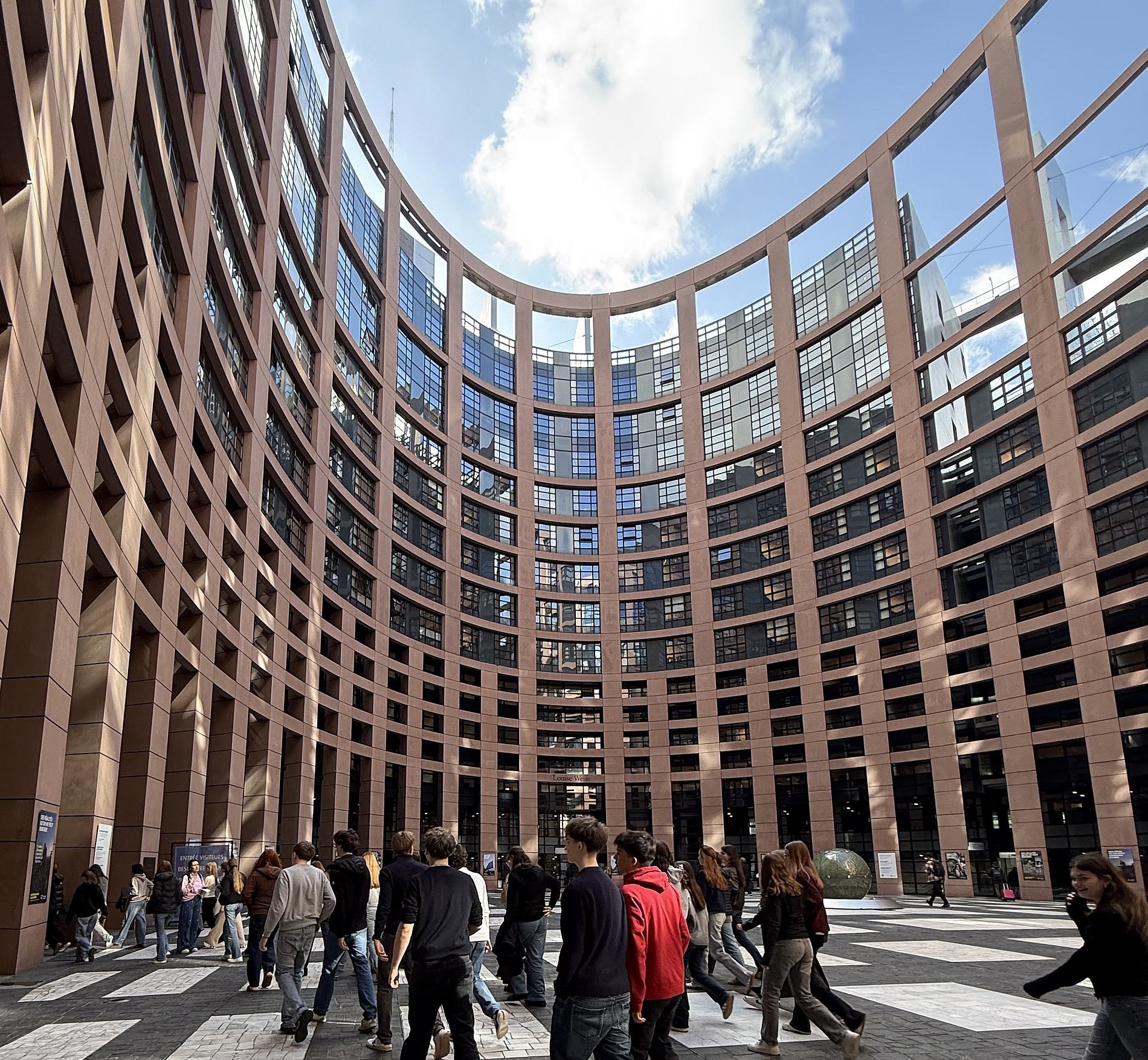 Schon früh am Morgen ging es mit dem Bus los. Die Erwartungen waren groß, denn viele von uns hatten das Europaparlament bisher nur aus dem Fernsehen oder aus dem Politikunterricht gekannt. Nach der Überquerung der französischen Grenze, konnten wir das Europaparlament bereits aus der Ferne sehen, woraufhin die Vorfreude noch mehr stieg. Nach einem kurzen Weg vom Bus zum Gebäude standen wir in einer langen Schlange, wo jeder der Besucher schon gespannt auf das Innere des Gebäude gewartet hat.