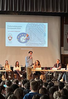 Spannender und abwechslungsreicher Austausch zur anstehenden Europawahl 2024. Schülerinnen und Schüler stellen Fragen an Abgeordnete.
